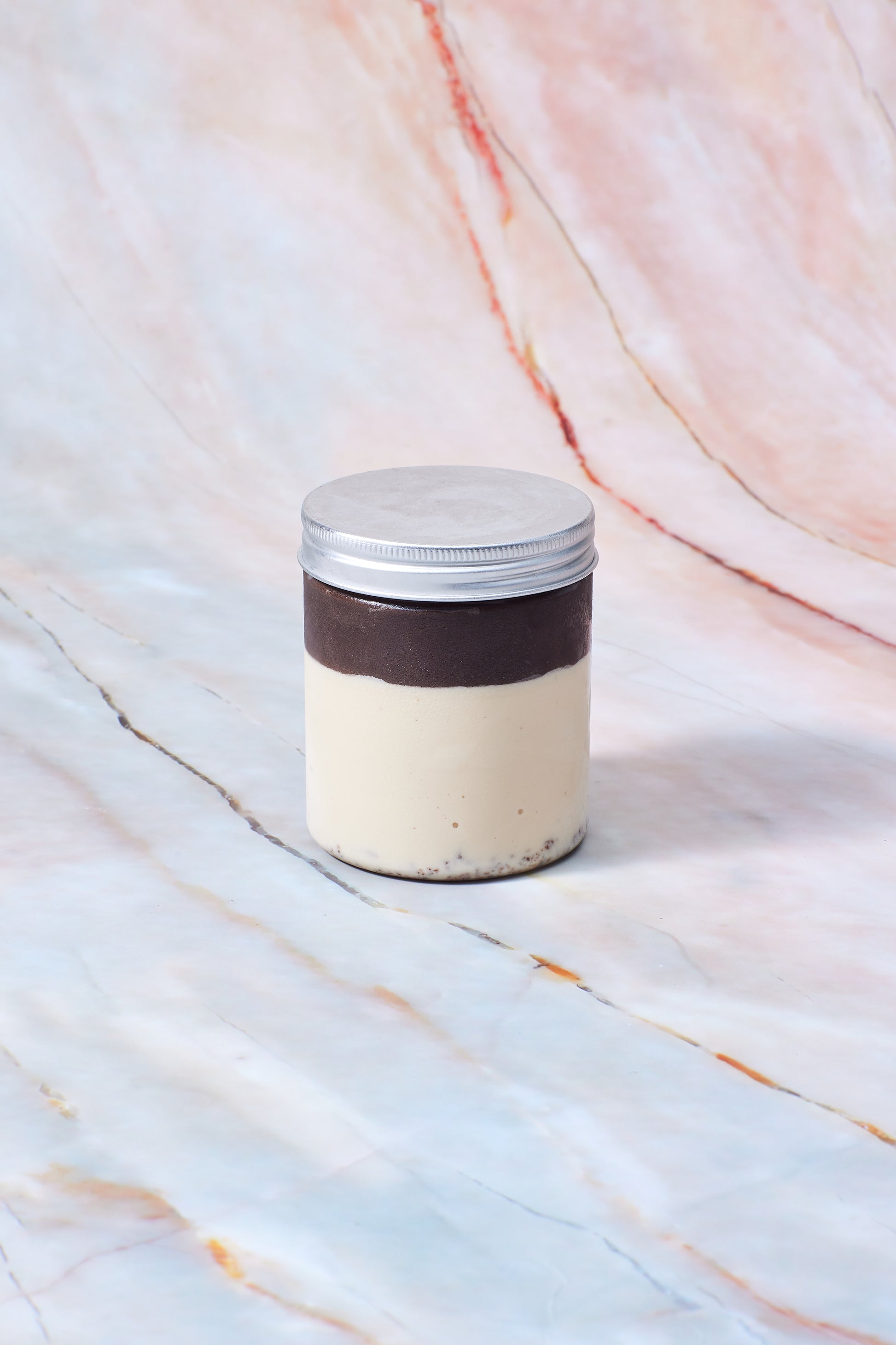 カカオ分を高くしたダークチョコレートをベースにした甘さ控えめのチョコレートセミフレッドの下には